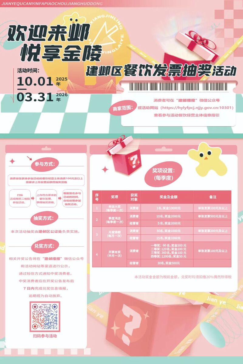 隨著國慶假期來臨,一場“歡迎來鄴 悅享金陵”的活動拉開大幕,無論建鄴居民、南京市民還是外地游客,只要在參與活動的餐廳就餐,消費(fèi)金額達(dá)到100元,然后把發(fā)票上傳到指定網(wǎng)址,就可以靜待抽獎。
