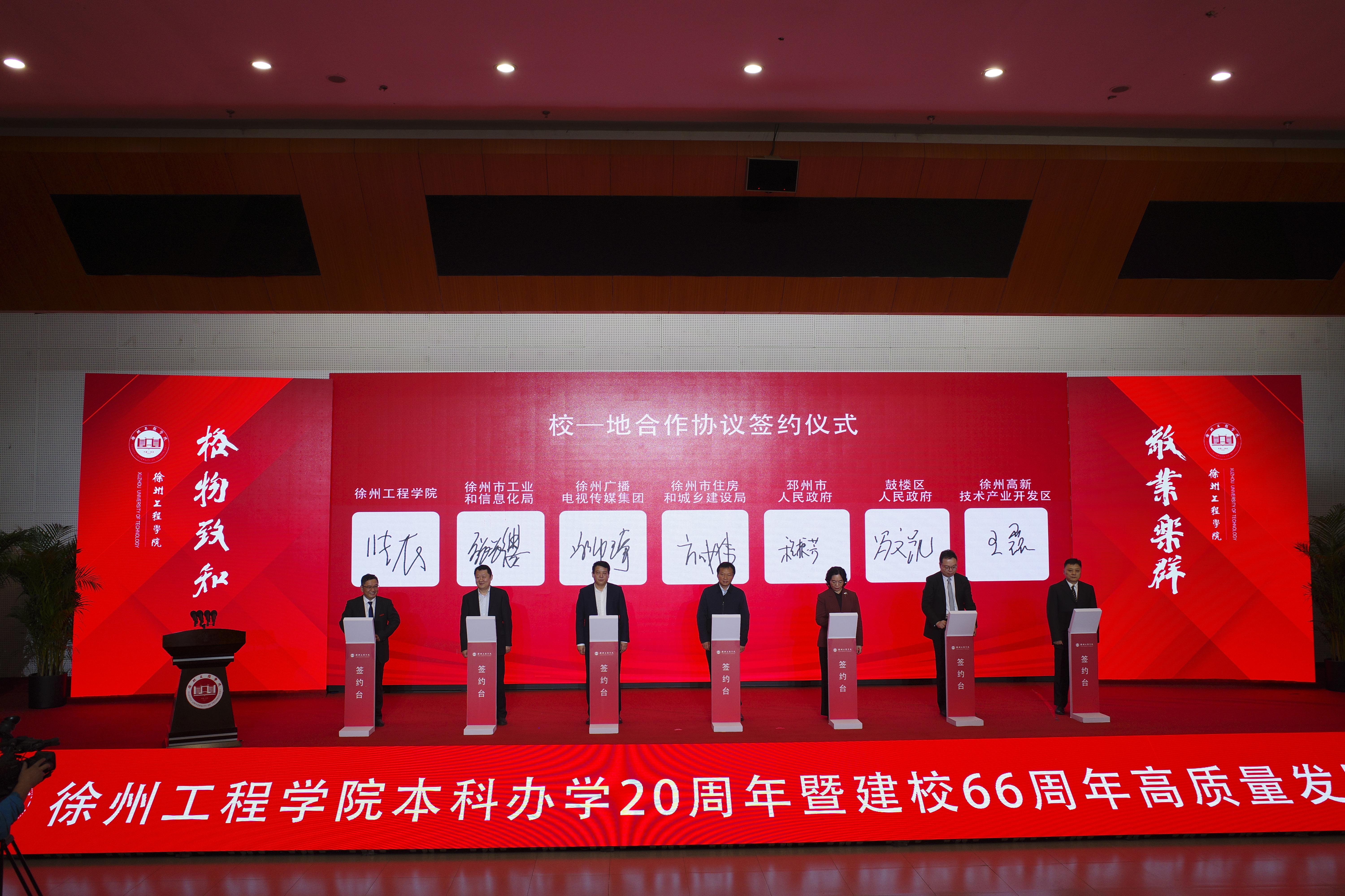 大會現(xiàn)場舉行合作簽約儀式。學(xué)校分別與徐州市工業(yè)和信息化局、徐州廣播電視傳媒集團(tuán)、徐州市住房和城鄉(xiāng)建設(shè)局、邳州市人民政府、鼓樓區(qū)人民政府、徐州高新技術(shù)產(chǎn)業(yè)開發(fā)區(qū)簽訂校地合作協(xié)議,與常州大學(xué)、中國礦業(yè)大學(xué)、南京工業(yè)大學(xué)、伊犁師范大學(xué)、新疆工程學(xué)院簽訂校校合作協(xié)議,與揚(yáng)州職業(yè)技術(shù)大學(xué)、徐州工業(yè)職業(yè)技術(shù)學(xué)院、江蘇財會職業(yè)學(xué)院、常州工程職業(yè)技術(shù)學(xué)院、江蘇食品藥品職業(yè)技術(shù)學(xué)院簽訂校校合作貫通式培養(yǎng)協(xié)議,與江蘇黎明控股集團(tuán)有限公司、徐州市蓋力工程機(jī)械有限公司、江蘇藍(lán)豐生物化工股份有限公司、徐州吉安礦業(yè)科技有限公司、江蘇華瑜變壓器有限公司、江蘇華旭環(huán)衛(wèi)科技有限公司簽訂校企合作項目協(xié)議。協(xié)議的簽訂,既是對學(xué)校前期校地、校校、校企深度合作的延續(xù),更是資源與智慧的深度融合新起點(diǎn),為學(xué)校發(fā)展注入了新動能,為區(qū)域產(chǎn)業(yè)高質(zhì)量發(fā)展提供了智力支撐。