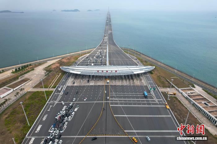 2024年3月30日,廣東珠海,港澳車輛經(jīng)港珠澳大橋珠海公路口岸入境。(無(wú)人機(jī)照片) 中新社記者 陳驥旻 攝